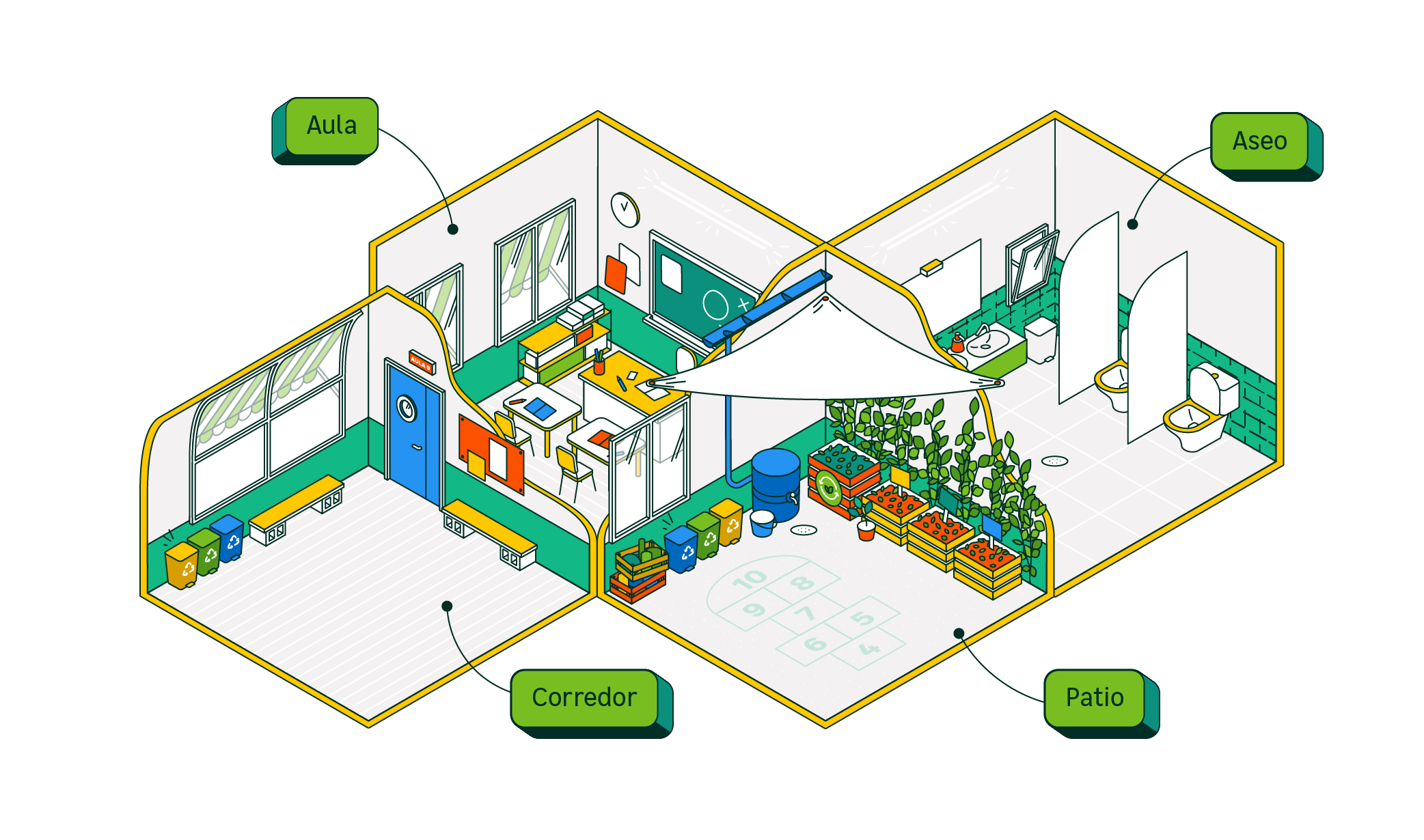 É o espazo onde se poñen en práctica actitudes responsábeis co ambiente: desde aprender a clasificar os residuos por medio das papeleiras de cores, como onde se adoptan medidas para o aforro dos recursos, onde se celebran os Días Mundiais do ambiente, etc. que fan do colexio o mellor lugar para poñer en marcha estilos de vida saudábeis e sustentábeis, e convertendo aos escolares en auténticos axentes de cambio.