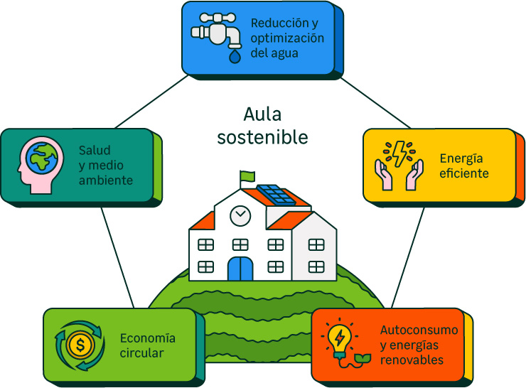 Las aulas sostenibles buscan, a través de 5 ejes, conseguir soluciones más beneficiosas con el planeta y que éstas redunden en el bienestar de las y los escolares.